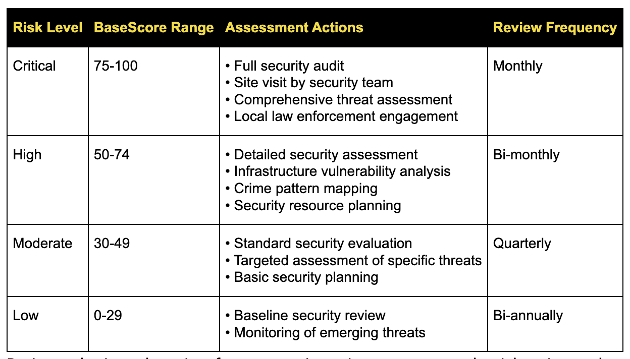 Resource allocation optimization: Use comparative risk scoring across locations to justify security personnel, technology, and budget distribution.