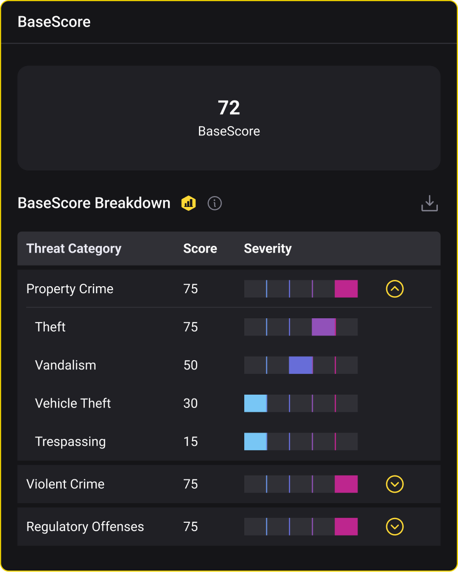 Yes. While BaseScore provides standardized scoring for comparability, threat categories included can be adjusted to emphasize risks most relevant to your operations. A retail company might weight property theft and shoplifting higher; a tech company might prioritize violent crime.