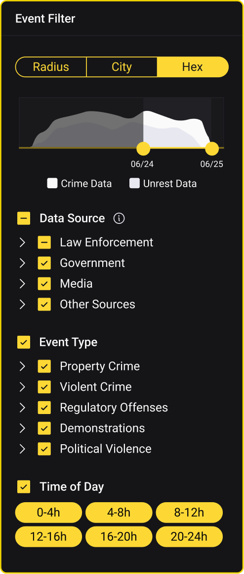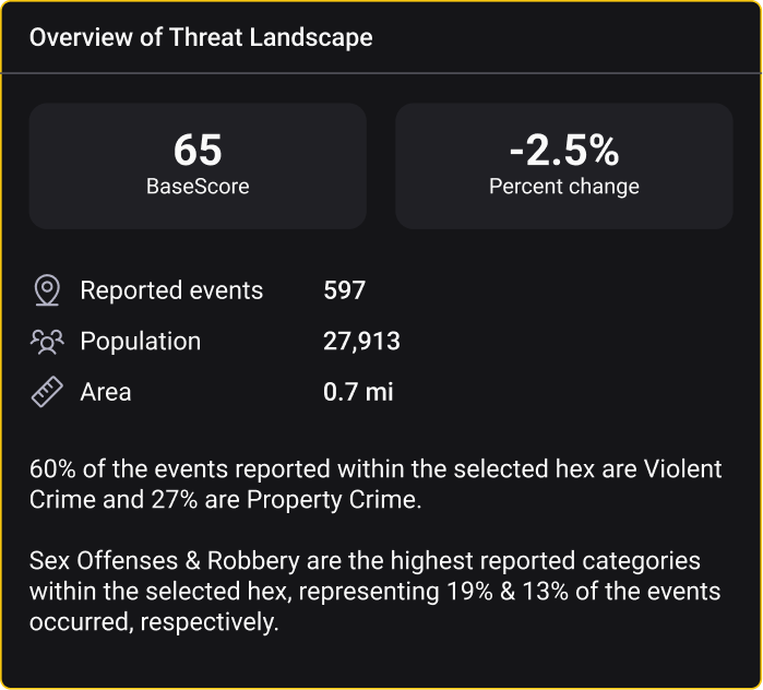 Cities aren't single risk zones. Your office in a business district has different risk than a warehouse in an industrial area. H3 grid and 0.1 mile radius granularity enables location-specific decisions: choosing between candidate buildings, adjusting guard levels by zone, routing travel through lower-risk corridors.