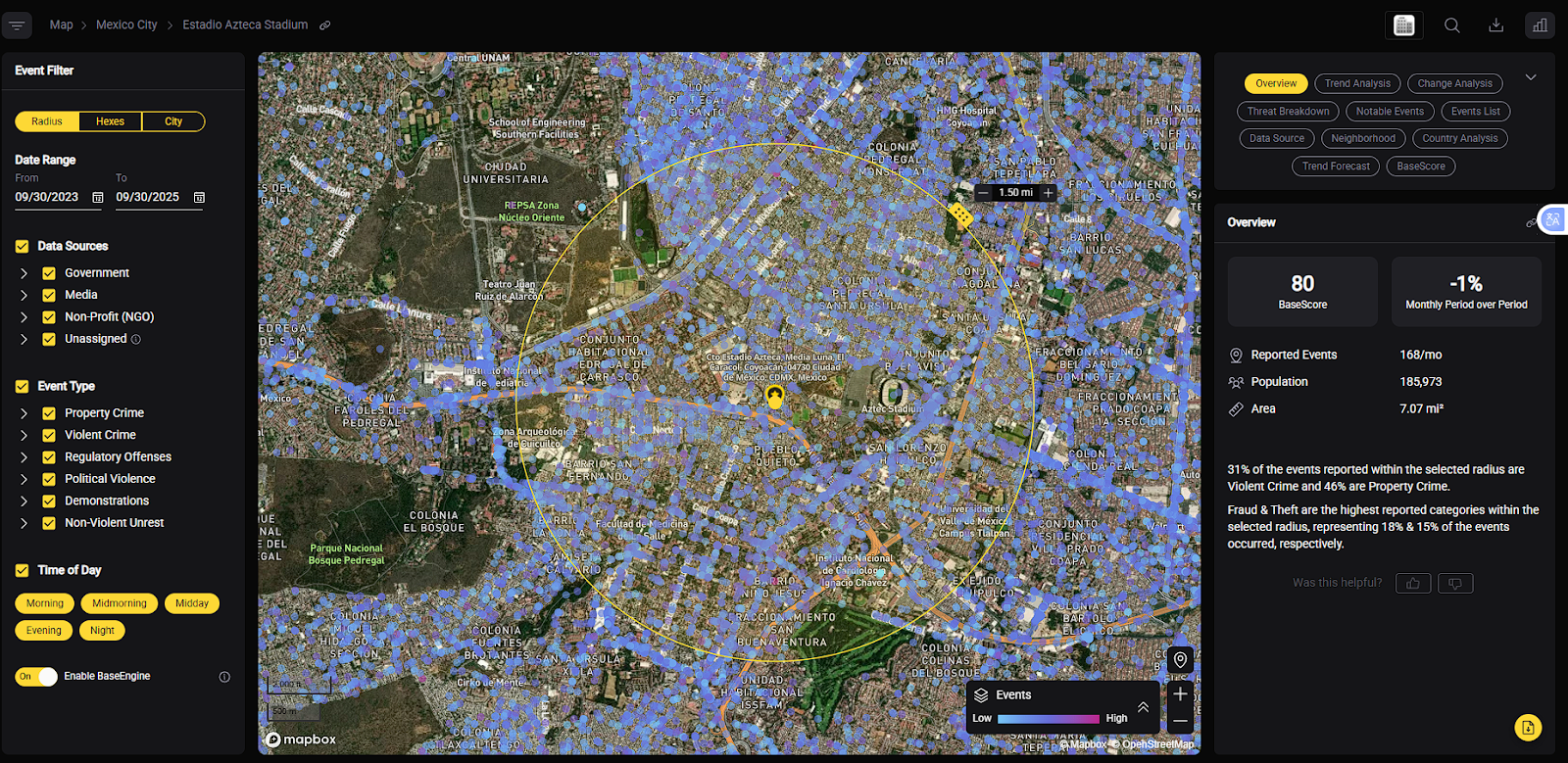 Estadio Azteca presents a Very High BaseScore Risk Tier (BaseScore 80) for the FIFA World Cup 2026 matches scheduled between June 11 and July 19, 2026. Base Operations validated, standardized, and actionable threat intelligence reveals elevated risk levels across multiple threat categories within 1.5 miles of the stadium (High Confidence).