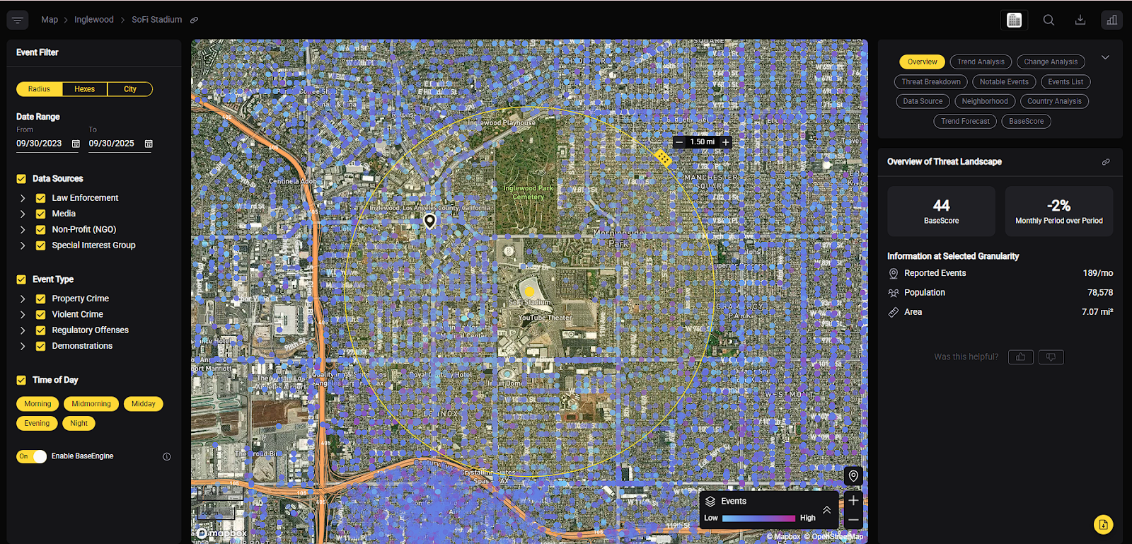 Base Operations. "SoFi Stadium Radius BaseScore Analysis." Geospatial Intelligence Report, October 2023 - September 2025. Accessed November 18, 2025.