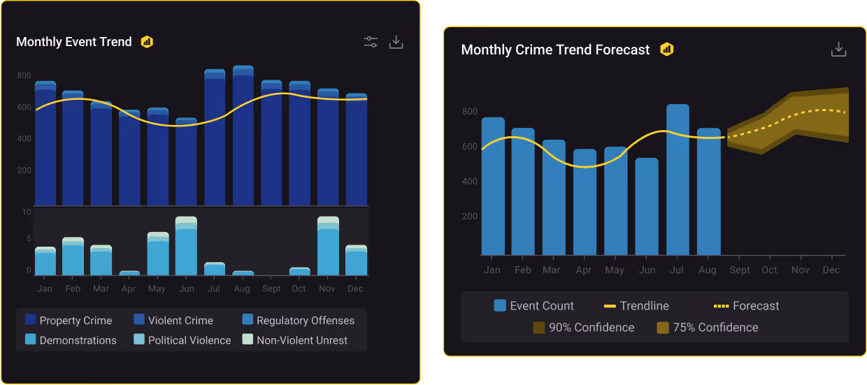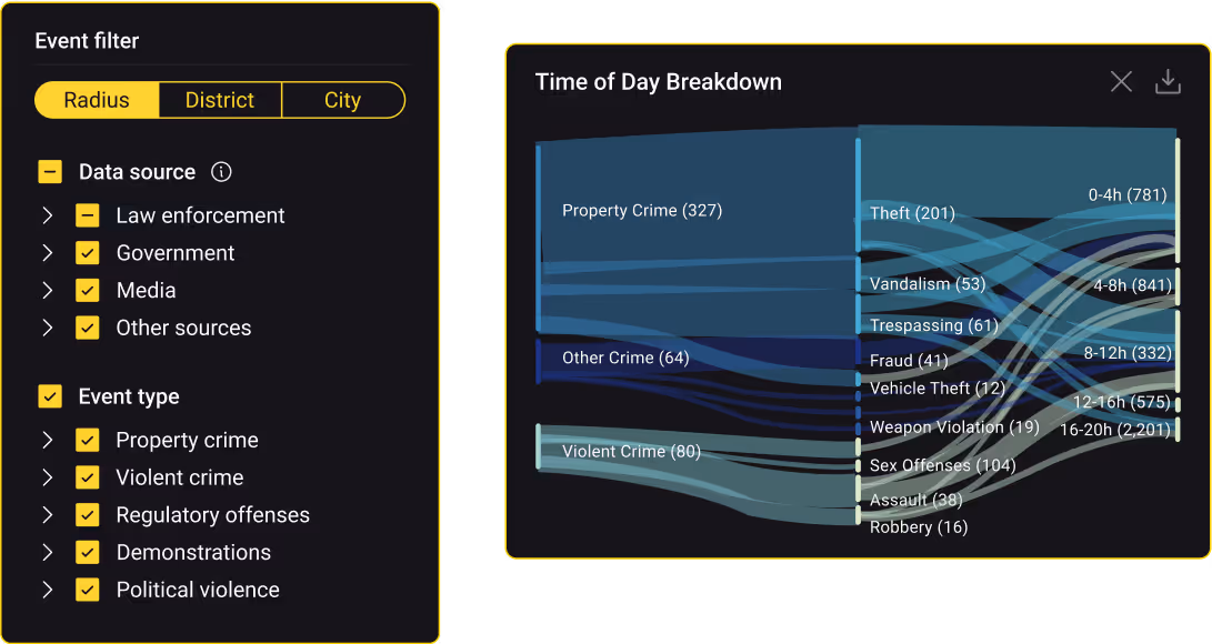 Get an overview of the threat landscape down to a sub-mile radius. Analyze country, city, district, and street-level threats.